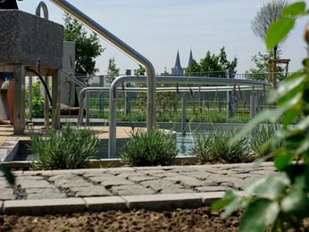 Besonders ist die Säule „Heilpflanzen“, an der, angepasst an den Standort, speziell Wasser-Heilpflanzen vorgestellt werden. Von einem erhöhten Steg mit Sitzpodest kann man den Wassergarten überblicken.